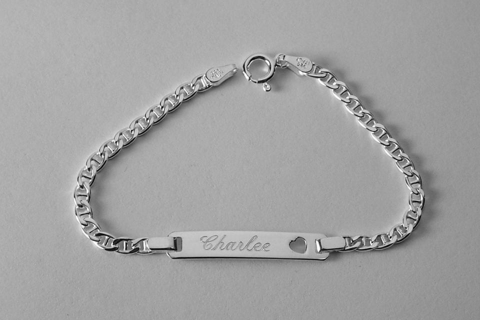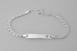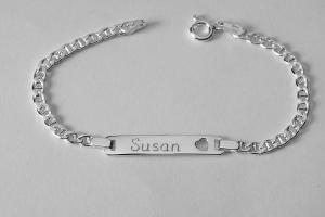 These fashionable bracelets never go out of style! This pretty sterling silver bracelet is 6 " long and features a little heart cutout on the ID plate. It has a spring ring clasp, and the identification plate is about 1" long overall and is 3/16" wide.