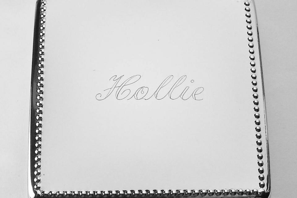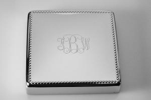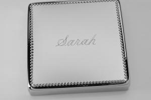 Custom Engraved Personalized Silver Square Jewelry Box with Beaded Trim - Hand Engraved