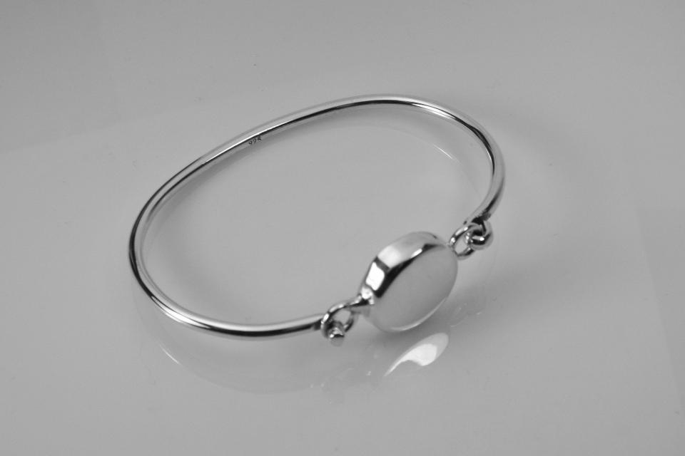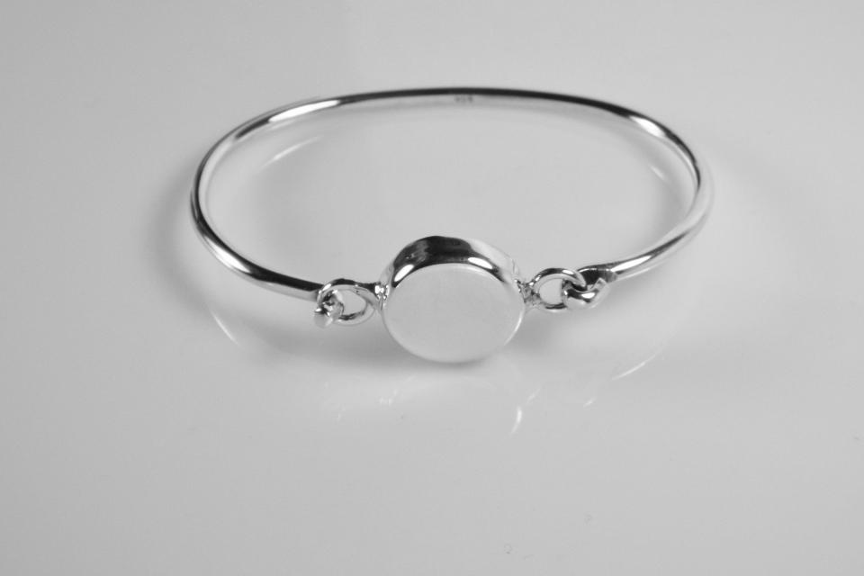 This beautiful bracelet is hand crafted using sterling silver tubing formed around a bracelet mandrel, then the ends are looped to make a clasp. The sterling engraving plaque is attached to one side with a closed loop, and the other half loop hooks to the ring on the other side. The engravable plaque measures about 11/16" and is a little over 1/8" thick. The inner diameter is 2.5", so it will fit up to a 7" wrist size.