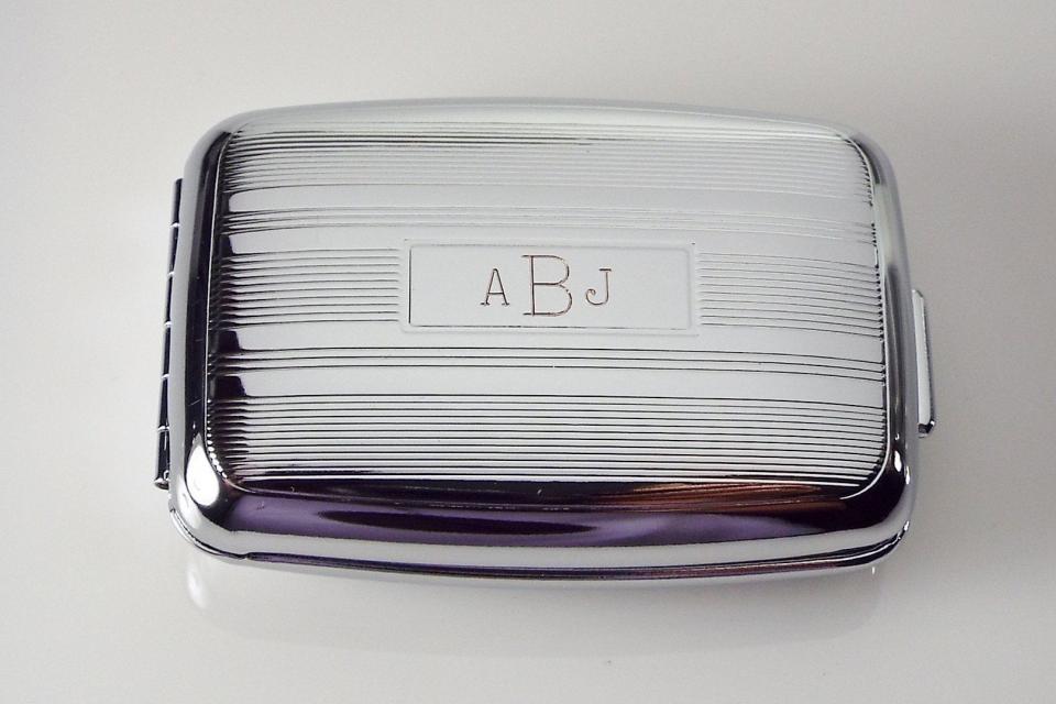 This high polish rectangular pill box features two roomy compartments for storage and measures about 2.5" long x 1 3/4" wide x a little over 1/2" deep. This one features factory embossed lines, with a 1" by 5/16" rectangle in the center of the lid for engraving.