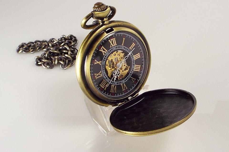 This pocket watch features a black dial with bright bronze color numbers and white accent hands. Military time is also noted in red, right above the roman numerals. The skeleton center gives you a glimpse of some of the wheels and cogs that make this pocket watch run! The watch case is made to look like an old-time, vintage timepiece!